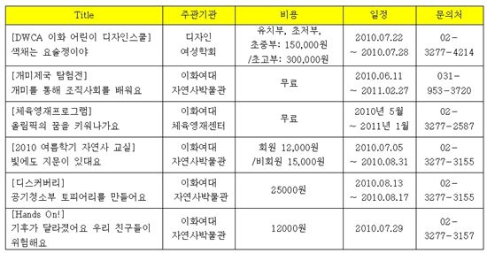 [아시아경제 김도형 기자]이화여자대학교(총장 이배용)가 본격적인 여름방학 시즌을 앞두고 초등학생 아이들의 창의력과 사고력을 키워줄 수 있는 단기 커리큘럼을 다양하게 선보인다. 미술, 자연, 체육, 과학 등 관심 분야별로 해당 분야의 교수 및 전문가들에게 배울 수 있는 다채로운 초등 교육 프로그램이다. 미술에 재능이 있거나 관심 있는 어린이들에게는 DWCA 이화 어린이 디자인스쿨이 어울린다. 창조적 사고를 위한 디자인 리더십 교육이 아동기 때부터 이루어져야 한다는 취지 아래 열리는 DWCA 이화 어린이 디자인스쿨은 분야별 전문가가 구성하고 디자인 전공 교수들이 직접 강의한다. 유치원생 및 초등학생을 대상으로 진행되는 이번 디자인스쿨은 오는 22일부터 28일까지 1주일 일정으로 진행되며 참가비는 유치부에서 초중부(3~4학년)는 15만원, 초고부(5~6학년)는 30만원이다. 체육영재센터에서는 서울 및 경기 북부지역 2~6학년 초등학생을 대상으로 ‘체육영재센터 교육 프로그램’ 을 운영하고 있다. 총 26주 동안 토요일마다 운동능력 향상, 인지 능력 및 인성교육, 학부모 프로그램 등 스포츠 과학에 기초한 맞춤형 체육 영재 교육과정을 진행하며 특히 7월에는 3박 4일간 자연친화 캠프도 마련된다. 교육비는 전액 무료이며 운동복과 운동화, 교재비, 교통비 일체도 지원한다. 이화여대 자연사박물관 특별기획전 ‘개미제국 탐험전’은 이화여대 교육복합단지가 들어서는 경기도 파주에 위치한 경기평화센터에서 2011년 2월 27일까지 진행된다. 이번 전시회는 생태계의 숨은 주인 노릇을 하는 개미 제국을 눈으로 보고 직접 체험할 수 있는 것이 특징이다. 개미 퍼즐 맞추기, 개미 의사소통 따라하기, 영상체험, e-learning 등의 체험코너들이 마련돼 있다. 관람료는 무료다.이 밖에도 이화여대 자연사박물관에서는 자연 현상에 대한 호기심과 창의력을 길러주는 ‘자연사교실’, 실천형 탐구활동 프로그램 ‘디스커버리’, 기후변화 학습 ‘Hands On!’ 등의 프로그램도 진행한다.