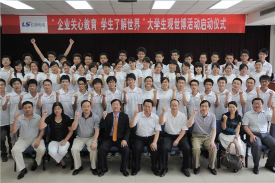 20일 중국 호북성 이창시에 위치한 삼협대학교에서 LS홍치전선 김선국 법인장(앞줄 좌측 네번째)을 비롯한 임직원과 대학생들이 발대식을 갖고 있다.