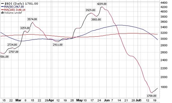 BDI는 지난 5월27일부터 7월16일까지 35일 연속 하락했다. 최근 하락세는 BDI에 가장 큰 영향을 미치는 철광석 수요가 중국에서 급감한 것에서 기인했다. 중국 6월 철광석 수입은 전월대비 14.66%나 감소한 것으로 나타났다.전문가들은 BDI가 바닥을 찍은 것으로 보이지만 아직 완연한 상승세로 돌아서기는 힘들 것으로 분석했다. 남반구의 곡물출하시기가 끝나고 북반구의 곡물출하시기를 기다려야 하는 계절적 요인도 BDI 반등을 제한하는 요인이다.선종별로 주로 석탄을 운반하는 파나막스선 운임지수 BPNI가 2.27% 오르며 5일째 상승세를 지속했다. 반면 케이프사이즈선 운임지수 BACI는 0.28% 떨어져 하루용선료 1만3266달러를 기록했다. 수프라막스선 운임지수 BASI도 1.26% 하락했다.정재우 기자 jjw@<ⓒ세계를 보는 창 경제를 보는 눈, 아시아경제(www.asiae.co.kr) 무단전재 배포금지>정재우 기자 jjw@<ⓒ아시아 대표 석간 '아시아경제' (www.newsva.co.kr) 무단전재 배포금지>