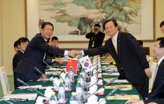▲ 윤증현 기획재정부 장관이 23일 중국 북경에서 열린 '제9차 한.중 경제장관회의'에 참석, 장핑 국가발전개혁위원회 주임(장관)과 악수를 하고 있다.<br />