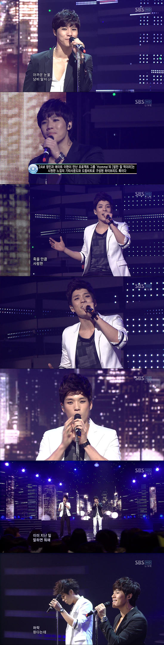 [아시아경제 최준용 기자] 국내 정상급 보컬리스트 2AM 창민과 에이트의 이현의 프로젝트 그룹 옴므가 베일을 벗었다.옴므는 1일 오후 3시 50분부터 생방송으로 진행된 여름특집 제3탄 SBS ‘인기가요’에 출연해 디지털싱글 음반 ‘옴므 바이 히트맨 뱅’(Homme By "Hitman" Bang)의 타이틀 곡 ‘밥만 잘 먹더라’를 공개했다.이날 방송에서 옴므는 깊고 파워풀한 가창력으로 시선을 끌었다. 특히 혼연일체 된 환상적인 하모니로 팬들의 함성을 자아냈다. 타이틀곡 ‘밥만 잘 먹더라’는 기타 사운드와 드럼이 마음까지 시원하게 해 주는 하이브리드 록 으로 듣고 있으면 모든 것을 다 잊고 떠나고 싶게 만드는 전형적인 여름 음악.방시혁의 첫 프로젝트 ‘옴므’는 창민과 이현을 통해 구체화 됐다. 정상급 프로듀서 방시혁의 주위에는 내로라하는 보컬리스트들이 즐비하지만, 창민과 이현의 결합이 떠오른 순간 대안은 없었다고 전하기도.한편 이날 방송에는 세븐, 태양, 샤이니, 손담비, MBLAQ, miss A, 나르샤, 간미연, 채연, Homme(2AM 창민 & 에이트 이현), Sistar, 틴탑, G.na, 인피니트, 장윤정, 길미, Rottyful sky, 곽현화, 김여희 등이 참여해 멋진 무대를 펼쳤다.(SBS 방송화면 캡처)최준용 기자 yjchoi01@<ⓒ아시아경제 & 스투닷컴(stoo.com)이 만드는 온오프라인 연예뉴스>