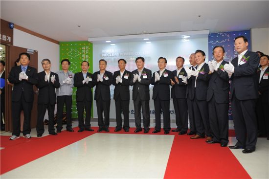 [아시아경제 황상욱 기자] 5일 경주시 성동동 KT경주사옥에서 열린 한국수력원자력(주) 경주본사 개소식에서 최경환 지식경제부장관(왼쪽에서 7번째), 김종신 한수원사장(8번째), 김관용 경북도지사(8번째), 최양식 경주시장(9번째) 등이 박수를 치고 있다.황상욱 기자 ooc@<ⓒ세계를 보는 창 경제를 보는 눈, 아시아경제(www.asiae.co.kr) 무단전재 배포금지>