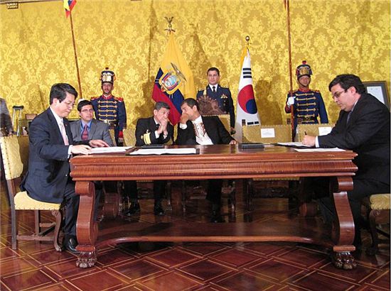 SK 건설이 사상 최대 에콰도르 정유공장 125억 달러 공사를 위한 기본설계를 2억 6000만 달러에 단독 수주했다. 사진은 지난 3월 진행된 계약식에서 계약서에 사인하 는 모습이다.