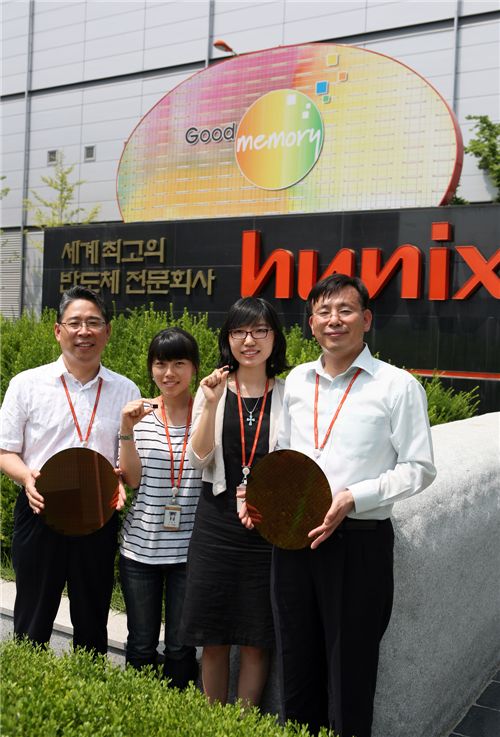 하이닉스 직원들이 세계 3번째로 양산에 돌입한 20나노급 64기가비트 제품을 들고 기념촬영을 하고 있다.