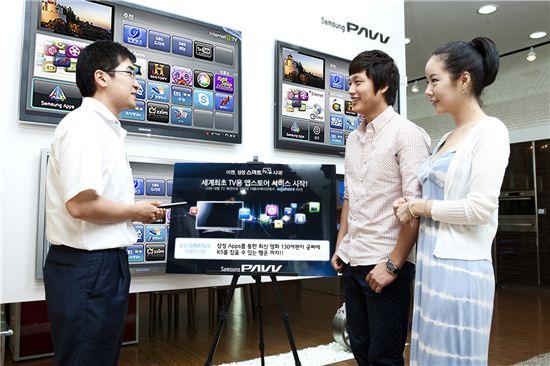 서울 청담동에 위치한 삼성전자 혼수가전 전문점인 삼성 마리에를 방문한 고객들이 삼성파브 스마트TV의 다양한 애플리케이션을 체험하고 있다.