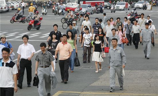 ▲ 9일 2주간의 휴가를 마치고 작업현장으로 들어서고 있는 현대중공업 울산 본사의 직원들.<br /> <br />