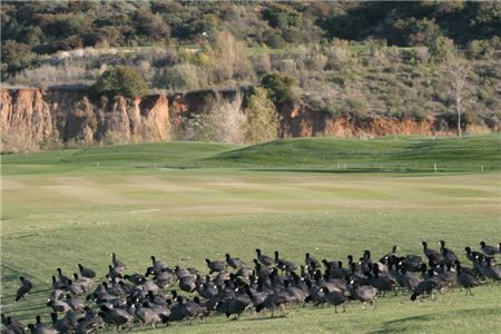 검은 물닭이 군락이 이뤄 코스 위에서 풀씨를 쪼고 있다.