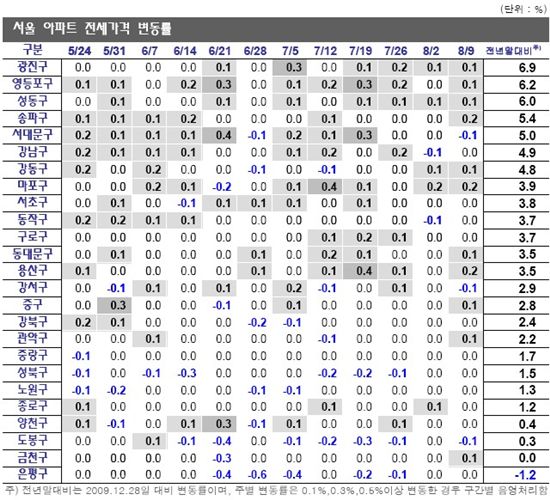 [아시아경제 황준호 기자] 지난주 서울 전세가격이 깜짝 상승했다. 가을 이사 수요가 피서철을 이용, 본격 움직이고 있기 때문이다. 계절적인 성수기에 갑작스레 전세가격이 오른 것을 경험한 바 있는 이사 수요가 한 두 달 먼저 전세계약에 나서고 있는 것으로 분석된다. 15일 KB국민은행연구소에 따르면 지난주 전국 아파트 전세가격은 0.1% 상승했다. 가장 많이 상승한 지역은 계룡(1.2%), 울산 울주군(1.0%), 시흥(0.7%), 부산 사하구(0.5%), 부산 해운대구(0.5%)순으로 나타났다. 반면 가장 많이 하락한 지역은 일산서구(-0.8%), 양주(-0.3%), 일산동구(-0.2%), 고양 덕양구(-0.1%), 파주(-0.1%) 순으로 기록됐다. 서울은 총 25개구 중 11개구가 상승세를 나타냈으며 3개구가 하락세를, 나머지가 보합세를 나타냈다. 지지난주 상승한 구는 5개구, 하락한 구는 2개구로 전세값 상승세를 보였던 구가 배로 급증했다. 강북 14개구 중 마포구(0.2%)는 주택구입보다는 전세를 선호해 전세물량 부족현상을 보이고 있다. 특히 북아현1~3구역, 대흥동 주거환경개선사업구역이 10월까지 이주 완료 예정으로 이에 따른 수요가 증가하는 수순이다. 용산구(0.2%)는 용산역세권 사업 난항 등으로 주택구입을 관망하며 전세를 유지하려는 수요와 신혼부부 수요 유입 등으로 서빙고동과 이촌동을 중심으로 올랐다. 성동구(0.1%)는 직장인 수요에, 예비신혼부부 수요가 가세하면서 상승하고 있다. 강남 11개구 중 송파구(0.2%)는 전세 재계약 증가와 신혼부부 수요, 방학을 이용한 학군수요 등으로 오름세를 지켰다. 영등포구(0.1%)도 가을 결혼을 앞둔 신혼부부 수요, 여의도 업무지구 근로자 수요가 유입되면서 상승세를 보였다. 경기 시흥(0.7%)은 인근 시화공단, 반월공단 근로자 유입으로 물량이 부족해지면서 가격이 뛰었다. 광명(0.3%)은 인근 구로 가산디지털 단지에 입주업체가 증가하면서 유입되는 근로자 수요 증가로 상승세를 기록했다. 대전 서구(0.3%)는 서대구산업단지, 대구3공업공단, 비산염색공업단지 등의 산업단지 근로자 수요가 꾸준히 증가하면서 소형을 중심으로 물량이 부족해지는 모습이다.울산 울주군(1.0%)은 온산국가산업단지 근로자 수요, 고리원자력발전소 근로자 수요 등이 맞물리면서 크게 올랐다.부산 사하구(0.5%)는 올해 8월까지 예정되어 있는 다대동 주공2단지 재건축 이주 수요 등으로 물량이 부족한 가운데, 을숙도 대교 개통으로 인한 녹산공단 근로자들의 수요가 늘어나고 있다. 해운대구(0.5%)는 올해 12월 자생한방병원 개원 및 센텀시티 내에 영화진흥위원회, 영상물등급위원회, 게임물등급위원회 등이 들어설 예정으로 영화, 영상 관련 IT기업이 들어서면서 인구유입이 증가하고 있다. 경상 거제(0.5%)는 대우조선, 삼성중공업 협력업체 직원들의 수요가 유입되면서 전세물량 부족으로 올랐다. 충청 계룡(1.2%)은 신규 아파트 입주물량이 부족한 가운데, 상대적으로 가격이 저렴하여 인근 대전, 논산에서 유입되는 수요가 증가하면서 물량 부족으로 12주 연속 상승세를 이어갔다. 황준호 기자 rephwang@<ⓒ세계를 보는 창 경제를 보는 눈, 아시아경제(www.asiae.co.kr) 무단전재 배포금지>