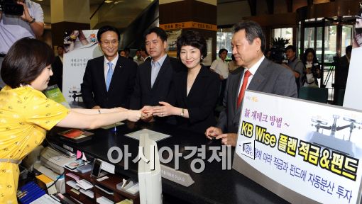 [아시아경제 이재문 기자]16일 오전 서울 KB국민은행 명동영업부에서 열린 그룹 시너지 복합상품 'KB WISE 플랜 적금.펀드' 출시 기념행사에서 어윤대 KB금융지주 회장(오른쪽)과 민병덕 KB 국민은행장(왼쪽), 고객대표들이 신규 가입을 하고 있다이재문 기자 moon@<ⓒ세계를 보는 창 경제를 보는 눈, 아시아경제(www.asiae.co.kr) 무단전재 배포금지>