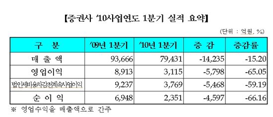 [아시아경제 이솔 기자]금융회사들이 주로 속해있는 코스피 시장 3월 결산 법인들의 1분기(4~6월) 영업이익이 지난해 같은 기간에 비해 큰폭 줄어든 것으로 나타났다. 17일 한국거래소(KRX)는 코스피 상장 3월결산 법인 52개사 중 지난해 실적과 비교가 가능한 48개사의 실적을 분석한 결과 총 영업이익 1조5231억원을 기록해 지난해 같은 기간 보다 15.40% 감소했다고 밝혔다.매출액은 30조852억원으로 지난해 1분기 대비 3.49% 늘었고 순이익은 1조5169억원으로 1.59% 늘었다. 영업이익의 하락은 금융사들의 실적 부진 때문이며 순이익 증가는 제조업을 하는 기업들의 실적 증가 덕분이다. 분석 대상이 된 48개 3월 결산 법인 가운데 금융업은 35개사, 제조업은 13개사가 속해있다. 매출액에서 금융사들이 차지하는 비중은 98%, 순이익에서는 96%를 차지한다.3월 결산 금융사 가운데는 증권사들의 실적 부진이 두드러졌다. 21개 증권사가 지난해 1분기 대비 15% 감소한 매출액(영업수익) 7조9431억원과 65% 감소한 영업이익 3115억원을 기록했다. 한국거래소 관계자는 증권사들의 실적 부진에 대해 "채권 금리 상승으로 채권관련 평가손실이 급증했고 증시가 부진한 흐름을 보이면서 거래대금이 줄어들었기 때문"이라고 진단했다. 올 1분기 주식시장 일평균 거래대금은 7조5466억원으로 지난해 1분기에 비해 22.45% 감소했다.