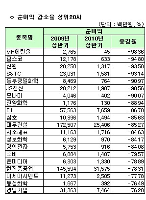 [2010상반기실적]상반기 순이익 감소율 상위 20개사 (전년 대비)