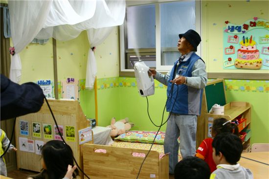 관악구 클린세상 방역사업단 소속 어르신이 어린이집 살균 작업을 하고 있다.