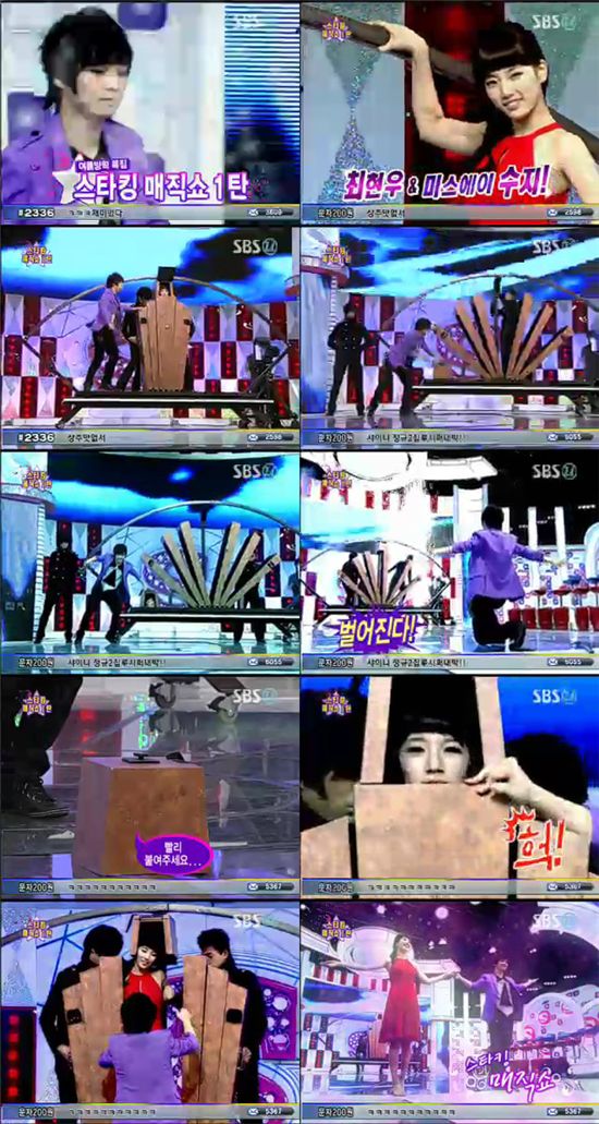 [아시아경제 최준용 기자]마술사 최현우가 SBS '놀라운 대회 스타킹(이하 스타킹)'에 출연해 마술쇼로 출연진을 사로 잡았다.21일 오후 방송된 SBS '스타킹'에 출연한 최현우는 '끝장 매직쇼'라는 이름으로 마술을 선보였다.최현우는 먼저 걸그룹 미쓰에이의 수지와 함께 마술을 시작했다. 그는 수지를 큰 상자 안에 넣은 뒤 몸을 절단하는 마술을 보여줘 출연진의 탄성을 자아냈다.마술을 마친 수지는 "현우오빠를 믿어 마술이 잘 끝난 것 같다"며 안도의 한숨을 내쉬었다.또 최현우는 과자마술, 마음을 읽는 주사위 마술, 투명한 테이블을 통과하는 동전마술을 선보였다.출연진들은 최현우의 마술에 "역시 최고의 마술사다"며 "어떻게 저런 일이 가능한지 정말 놀랍다"며 감탄을 금치 못했다.한편 이 날 방송된 SBS '스타킹'에서는 2010 미스코리아의 첫 예능 신고식, 4살짜리 뱀소녀, 가인과 닮은 꼴 서예슬이 출연해 시청자의 이목을 사로잡았다.최준용 기자 yjchoi01@<ⓒ아시아경제 & 스투닷컴(stoo.com)이 만드는 온오프라인 연예뉴스>