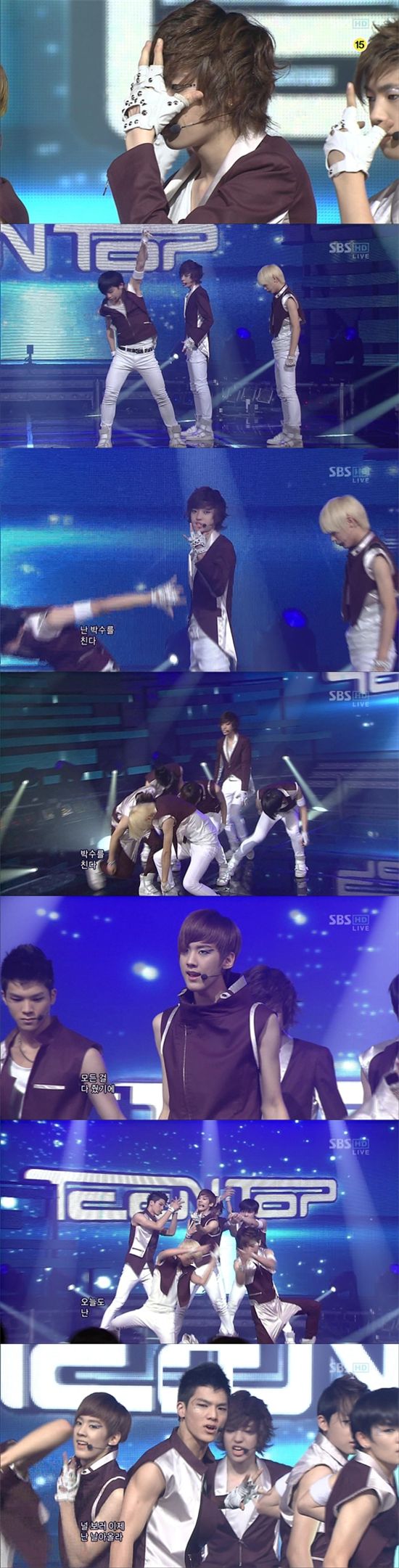[아시아경제 최준용 기자] 실력파 아이돌 그룹 틴 탑(TEEN TOP)이 완벽한 군무와 강렬한 무대매너로 신인답지 않은 모습을 보여줬다.틴탑은 22일 오후 4시부터 생방송으로 진행된 SBS '인기가요'에 출연해 첫 번째 데뷔 음반 ‘컴 인투 더 월드’(Come into the World)의 타이틀 곡 ‘박수’를 공개했다.이날 타이틀곡 ‘박수’의 무대에서 틴탑은 남성미 넘치는 무대의상으로 시선을 끌었으며 멤버들의 완벽한 호흡, 잘 맞아 돌아간 군무와 파워풀한 랩, 그리고 호소력 있는 보컬라인으로 팬들의 함성을 이끌어냈다. 특히 신인답지 않은 강렬한 눈빛과 여유 있는 무대 퍼포먼스로 한 층 성숙한 무대를 펼쳤다.이번 음반의 타이틀곡 ‘박수’는 사랑하는 여자친구를 잃은 상실감에 미칠 것 같은 슬픔과 그리움을 표현한 가사가 인상적인 파워풀한 댄스곡. 반복적으로 들리는 강한 Clap소리와 심장을 울리는 신디사이저 비트가 개성 있는 틴탑의 보컬 음색과 어우러져 파워풀하면서도 애절한 슬픔을 독특하게 표현하고 있다. 또, 수퍼스타K 출신으로 T-MAX에 합류한 주찬양이 코러스로 참가한 ‘박수’는 TEEN TOP(틴탑)의 독특한 메인 보컬의 음색과 호소력 있는 애절한 애드립, 파워풀한 랩이 조화를 이루며 틴탑이 실력파 신인임을 입증했다.한편 이날 무대에는 보아(BoA), 세븐, 샤이니, 손담비, 태양, 채연, 시크릿, 레인보우, 초신성, 조성모, 서인국, 인피니트, 틴탑, 장윤정, 나비, 이루, 허니패밀리, 제이큐티(JQT), 아리, 플라워 등이 참여해 멋진 무대를 선사했다.최준용 기자 yjchoi01@<ⓒ아시아경제 & 스투닷컴(stoo.com)이 만드는 온오프라인 연예뉴스>