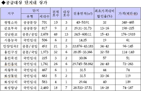 [아시아경제 소민호 기자] 한국토지주택공사(LH)는 경기도내 12개 지구 단지내상가 48호를 가격할인, 인터넷 경쟁 입찰방식으로 공급한다.이들 상가는 광명소하, 성남판교, 용인구성, 용인흥덕, 화성향남 등 경기 지역에 소재한 성장성과 투자가치가 높다. LH는 침체된 시장 상황을 감안, 분양가격을 최초 분양가 대비 최고 57% 할인된 가격으로 공급한다.분양가격은 1층 기준 3.3㎡당 448만1000~2348만1000원으로 인근지역시세보다 13~50% 낮은 수준이다. 대금납부조건은 계약금 20%, 중도금 30%, 잔금 50%다.입찰신청은 8월30~31일 오전 10시부터 오후 4시까지 LH 분양임대청약시스템(//myhome.lh.or.kr/)에서 가능하다. 입찰결과는 8월31일 오후 6시 이후 분양임대청약시스템에 게시될 예정이다.분양관련 상담문의는 LH 경기지역본부 고객상담실(031-250-8380~6)로 하면 된다.