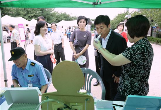 김영배 성북구청장이 24일 오전 돈암삼성아파트에서 열린 성북구 찾아가는 건강한마당 축제에 참석, 일산화탄소 잔존량 측정을 받고 있다.<br /> <br />