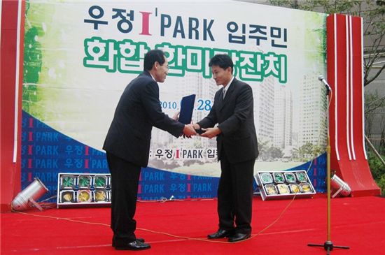 울산 우정 아이파크 입주자 대표 이상호씨(사진 오른쪽)가 우정 아이파크 현장소장이었던 현대산업개발 김종팔 상무(사진 왼쪽)에게 감사패를 전달하고 있다. <br />