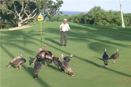 하와이 마우나케어골프장 1번홀 그린. 칠면조가 퍼팅을 방해하고 있다.