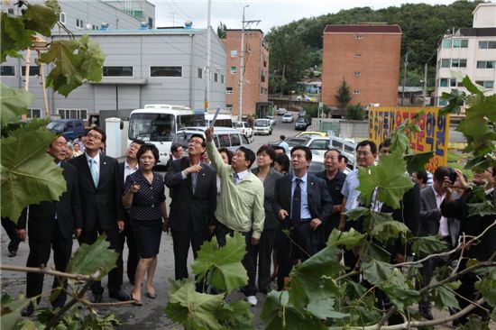 이성 구로구청장과 김병훈 구로구의회 의장 등이 곤파스 피해 현장을 찾아 복구 방안을 찾고 있다.