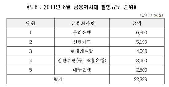 [아시아경제 이솔 기자]8월 회사채 발행 규모가 7월 보다 30% 감소했다. 5일 한국예탁결제원은 8월 회사채 전체 발행규모는 7조7513억원으로 7월 11조1407억원 보다 30% 감소했다고 밝혔다. 7월에는 7778억원 순발행됐지만 8월에는 1조5390억원의 순상환(발행금액보다 상환금액이 큰 경우)으로 전환됐다.일반 회사채의 경우 4조164억원 규모가 발행돼 7월 보다 12% 늘어났다. 특히 일반 회사채 가운데 가증 비중이 큰 무보증사채가 3조6260억원 규모로 발행돼 일반 회사채 전체 발행규모의 증가를 견인했다. 종류별로는 무보증사채가 3조6260억원으로 가장 많았고 자산유동화채(815억원), 옵션부사채(2204억원), 신주인수권부사채(690억원) 등이 뒤를 이었다. 발행 목적 별로는 만기 상환을 위한 차환발행이 1조8474억원으로 가장 큰 비중을 차지했다. 포스코가 5000억원을 발행한 것을 비롯해 대한항공(3000억원), 우리금융지주(3000억원) 등이 뒤를 이었다. 일반 회사채 발행 규모 상위 10개사에 이름을 올린 회사들이 발행한 회사채 금액은 2조4000억원으로 전체의 60%를 차지했다.금융 회사채는 3조7349억원 발행돼 전월 보다 51% 감소했다. 금융 회사채 가운데 가증 비중이 큰 일반 은행채의 발행규모가 1조5600억원으로 전월 대비 70% 감소하면서 전체 규모에 영향을 줬다.금융 회사채는 통안채와 특수금융채권(산금채 중금채 농금채 수산금융채 수출입금융채 주택채)을 제외한 금융회사가 발행하는 채권을 말한다.