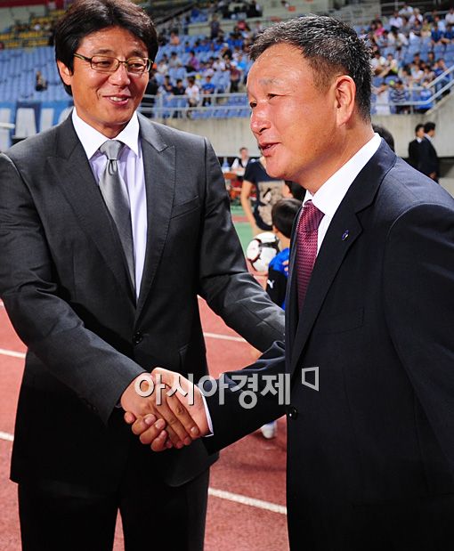 [인천=스포츠투데이 한윤종 기자]4일 인천월드컵경기장에서 벌어진 프로축구 쏘나타 K리그 2010 인천 유나이티드와 부산 아이파크의 경기전 허정무, 황선홍 감독이 악수를 나누고 있다.스포츠투데이 한윤종 기자 hyj0709@<ⓒ아시아경제 & 재밌는 뉴스, 즐거운 하루 "스포츠투데이(stoo.com)">