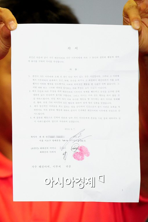 [스포츠투데이 최준용 기자]태진아측이 최희진이 그동안 고수했던 입장을 갑자기 바꾼 것에 대해 밝혔다.태진아측은 7일 오후 9시 30분쯤 서울 서초동 소재 자신의 법무법인 건물 5층에서 기자회견을 열었다. 태진아측은 최희진이 사과의 각서가 담긴 문서를 공개하며 사건이 종결됐음을 밝혔다.최희진이 그간 고수했던 입장을 갑자기 바꾼 것에 대해 태진아측 법무 변호인은 “그동안 조용하게 그녀의 주장이 거짓임을 명확하게 밝혀줄 수 있는 증거수집에 공을 들였으며, 그 사실을 안 최희진이 심리적으로 많은 부담감을 안았던 것”이라고 이유에 대해 말했다.이어 변호인은 “그동안 그녀가 인터넷이나 언론을 통해 밝힌 것은 사실과 다르며 그녀가 우리측에 보낸 편지들을 다량 보유하고 있다. 이미 상대가 우리에게 용서를 구한 상태에서 구체적으로 밝히는 것은 적절치 않다”고 말을 아꼈다.끝으로 변호인은 “최희진이 사과 각서를 남긴 만큼 그녀가 그 각서 내용대로만 지켜준다면 더 이상 문제가 불거지지 않을 것이다”고 말하며 사건 종결을 선언했다.한편 태진아측이 밝힌 최희진이 남긴 각서에 따르면 그녀는 이제 까지 밝혀왔던 결별과정에서의 폭언, 협박, 임신, 낙태종용설 등은 사실이 아니었음을 시인했고, 더 이상 이런 일을 벌이지 않고 자숙하며 살겠다고 밝히며 깊은 사과를 전했다.