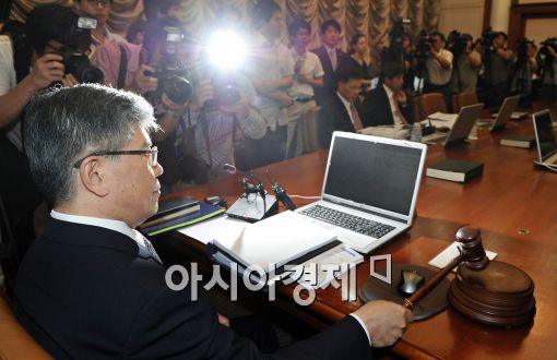 [아시아경제 이재문 기자]김중수 한국은행 총재가 9일 오전 서울 소공동 한국은행에서 열린 금융통화위원회의에서 시작을 알리는 의사봉을 두드리고 있다.이재문 기자 moon@<ⓒ세계를 보는 창 경제를 보는 눈, 아시아경제(www.asiae.co.kr) 무단전재 배포금지>