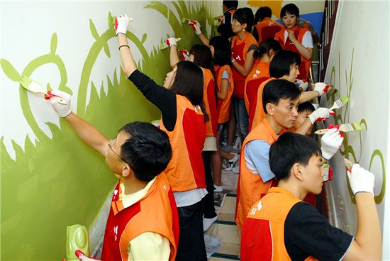 SK건설 자원봉사단이 지난 11일(토), 서울 종로구 구기동에 위치한 청운양로원에서 '가족과 함께하는 벽화그리기 봉사활동'을 실시했다. 사진은 청운양로원의 실내 벽에 봉사단원들이 벽화를 그리고 있는 모습.<br />