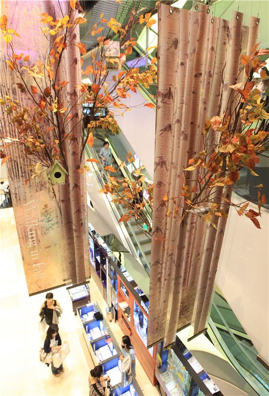 [아시아경제 박소연 기자]아침, 저녁으로 선선한 날씨를 보이는 13일 현대백화점 압구정본점은 가을분위기 물씬 나는 디스플레이로 고객들의 눈길을 끌고 있다. 나무와 낙엽, 새와 새집 등으로 백화점의 내부 곳곳을 꾸며놓았다. 박소연 기자 muse@<ⓒ세계를 보는 창 경제를 보는 눈, 아시아경제(www.asiae.co.kr) 무단전재 배포금지>