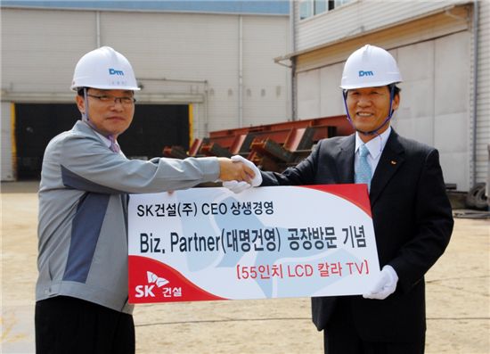 SK건설은 지난 14일(화) 오후 충청북도 진천군 덕산면 구산리에 위치한 대명건영의 진천공장을 방문해 공장견학과 함께 SK건설의 상생경영에 대한 간담회를 실시했다. 사진은 SK건설 윤석경 부회장(사진 오른쪽)과 대명건영 김정석 사장(사진 왼쪽)이 기념품 증정식에서 악수를 하고 있는 모습.<br />