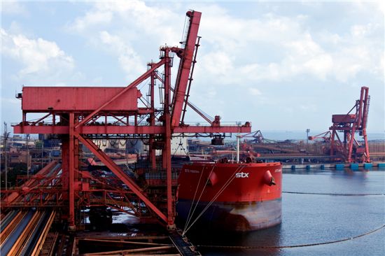 포스코 전용선 계약을 수행 중인 18만t급 케이프 사이즈 벌크선 STX FREESIA(프리지아)호가 석탄 하역 작업을 하는 모습.