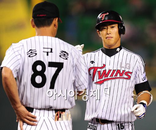 [스포츠투데이 한윤종 기자]16일 오후 서울 잠실야구장에서 열린 '2010 CJ마구마구 프로야구' 엘지 트윈스와 SK 와이번스의 경기. 3회말 엘지 선두타자 정주헌이 안타를 날리고 송구홍 코치와 하이파이브를 하고 있다.스포츠투데이 한윤종 기자 hyj0709@<ⓒ아시아경제 & 재밌는 뉴스, 즐거운 하루 "스포츠투데이(stoo.com)">