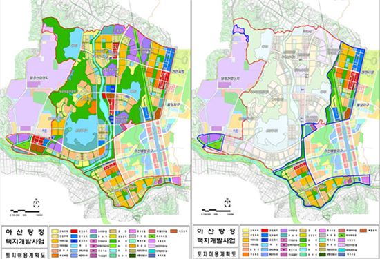 아산신도시 2단계 2차지구 사업 당초 토지이용계획도(왼쪽)와 변경 계획도 모습