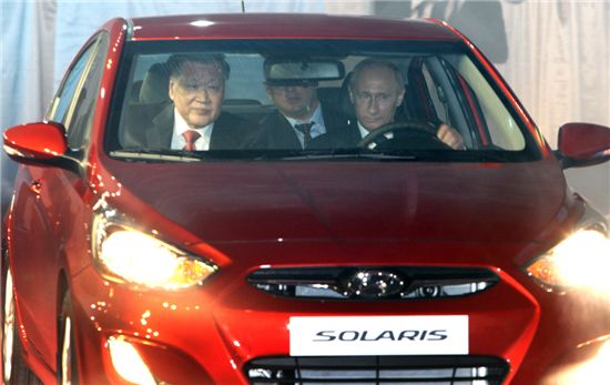 [아시아경제 최일권 기자] 정몽구 현대자동차그룹 회장(왼쪽)과 블라디미르 푸틴 러시아 총리가 21일(현지시간) 열린 러시아 상트페테르부르크(St. Petersburg) 현대차 공장(HMMR, Hyundai Motor Manufacturing Rus.) 준공식에서 현지에서 생산된 소형차 '쏠라리스'를 시승하고 있다.최일권 기자 igchoi@<ⓒ세계를 보는 창 경제를 보는 눈, 아시아경제(www.asiae.co.kr) 무단전재 배포금지>