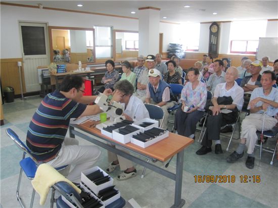 어른신들의 맞춤안경 지원을 위해 시력측정을 하는 모습. <br />