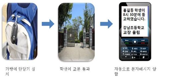 [아시아경제 박종일 기자]강남구(구청장 신연희)가 10월 1일부터 학생들의 등하교 시간을 부모의 휴대폰 문자로 알려주는 ‘어린이 안심서비스’를 시범운영한다.지난 16일 ‘학교 보안관 연합발대식’을 시작으로 본격적인 아동 성범죄와 학교폭력 예방 활동에 돌입한 강남구가 이번엔 학교안전 취약시간대인 등하교 시간을 잡겠다고 나선 것이다.‘어린이 안심서비스’는 학생들의 등하교 시간을 각각의 부모에게 문자메시지(SMS)로 자동 전송하는 시스템인데 학생들의 가방에 부착된 송출기 신호를 학교 교문에 설치된 무선 자동인식기가 감지해 작동하게 된다.KT 지원으로 내년 2월까지 수서·일원·개포지역에 거주하는 초등학생 중 200명에게 시범 운영하게 되는데 점차 지원을 확대해 나갈 계획이다.
