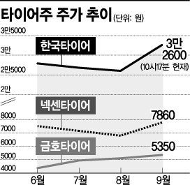 [아시아경제 이솔 기자]타이어 업종이 이달 들어 완성차 업종 못지 않은 상승세를 보이고 있다.매출의 40% 이상 비중을 차지하는 원재료값이 연일 오르면서 부담으로 작용하고 있음에도 외국인 투자자들이 타이어 업종의 성장성에 베팅하며 러브콜을 보내고 있다.30일 코스콤에 따르면 타이어 업종 3개 회사 가운데 시가총액이 가장 큰 한국타이어는 9월 들어 23.99% 급등했다. 외국인 투자자들의 매수세가 집중 유입된 덕분이다. 9월 들어 외국인 투자자는 한국타이어 868억원 어치를 사들이며 보유율을 41.73%에서 43.65%까지 확대했다. 같은 기간 넥센타이어와 금호타이어 역시 각각 7.53%, 2.77% 올랐다.증시 전문가들은 타이어의 주 원재료인 고무 가격 급등이 오히려 한국 업체들의 경쟁력을 강화하는 기회가 될 수 있다는 사실에 주목하고 있다.고태봉 IBK투자증권 애널리스트는 "세계 유수의 타이어 업체들의 가격 전가 능력이 한계에 봉착해 있는 반면 후발 주자인 한국 업체들은 상대적으로 가격 전가가 용이하다는 장점이 있다"며 원가 부담에도 불구하고 외국인 투자자들의 시각이 긍정적이라고 전했다. 올해 천연고무 가격은 주요 재배 지역의 가뭄과 수출관세 부과 등의 영향으로 연초보다 20% 넘게 급등, 톤당 3000달러를 넘어섰다. 임은영 동부증권 애널리스트는 "타이어 수요가 회복되지 않은 상황에서 고무 가격 상승이 지속된다면 한국 업체들이 오히려 '생존자 효과'를 누릴 수 있다"고 말했다.동부증권은 신흥 시장의 현지 타이어 업체들이 가장 큰 타격을 받을 것으로 내다봤다. 상위 업체들 역시 선진국 시장에 집중된 시장 포트폴리오와 원자재 가격 상승으로 인한 수익성 악화로 신흥시장에 제대로 대응하지 못했다는 점에서 한국 업체들의 점유율 확대도 기대할만 하다.중국 시장에서의 경쟁력도 타이어 업체들의 성장성을 부각시키는 요소다. 중국 시장에서는 해마다 신차 판매가 늘어나면서 교체용 타이어 수요도 함께 늘어나고 있다.임 애널리스트는 "한국 타이어 회사들은 중국시장을 선점, 경쟁사 보다 높은 브랜드 이미지를 구축했다"며 "중국시장에서의 교체용 타이어 수요 증가와 고성능 타이어 수요 확대로 실적 가시성이 높아졌다"고 말했다. 이에 중국 시장의 성장과 함께 한국 타이어 회사들의 도약이 예상된다는 설명이다. 한국 회사들의 중국 시장 점유율은 전체 수요의 39% 수준으로 한국타이어가 프랑스 업체 미쉐린 굿이어와 함께 제1그룹을 형성하고 있다.이솔 기자 pinetree19@<ⓒ세계를 보는 창 경제를 보는 눈, 아시아경제(www.asiae.co.kr) 무단전재 배포금지>