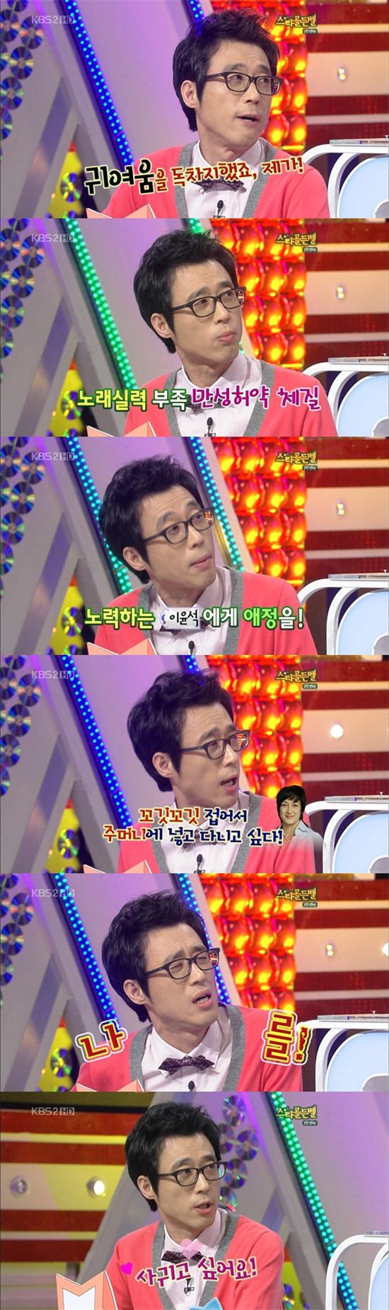 [스포츠투데이 최준용 기자]개그맨 이윤석이 “박칼린 선생님가 다음생에 사귀고 싶다”고 고백했다.2일 방송된 KBS2 '스타골든벨 1학년 1반'에 이윤석이 출연해 남자의 자격 에피소드를 얘기하던 중, 박칼린 선생님에 대한 남다른 애정을 밝혔다.지석진이 ‘박칼린 선생님이 이윤석씨를 편애했다면서요?’라고 말문을 열자 이윤석은 “귀여움을 독차지했었다.”고 고백해 모두의 이목을 집중시켰다. 이어 이윤석은 "안 되는 몸으로 열심히 하는 모습을 보고 박칼린 선생님이 꼬깃꼬깃 접어 주머니에 넣어 다니고 싶다고 했을 정도로 귀여워 하셨다"며 "다시 태어나면 박칼린 선생님과 사귀고 싶다"고 폭탄발언 해 모두를 깜짝 놀라게 만들었다. 이에 윤형빈이 "진짜 이윤석 형은 모두가 모인 자리에서도 칼린 선생님을 좋아하는 표현을 대놓고 하시는데 칼린선생님은 허허 웃으시면서 빨리 다른 화제로 넘기고 싶어 한다"고 고백해 녹화장을 웃음바다로 만들었다. 이날, 남자의 자격 팀은 합창단 팀에 스카우트 하고 싶은 멤버로 전현무를 꼽았다. 털이 많아서 바리톤 얼굴이라고 이구동성으로 밝혔다.한편 이날 ‘스타골든벨’에는 고주원, 추소영, 윤주희, 이윤석, 김대희, 홍인규, 윤형빈, KCM, 배다해, 선우, 엠블랙(천둥, 미르), 걸스데이(민아, 지해), 주라, 에이미 등이 출연해 재치있는 입담을 펼쳤다.스포츠투데이 최준용 기자 yjchoi01@<ⓒ아시아경제 & 재밌는 뉴스, 즐거운 하루 "스포츠투데이(stoo.com)">