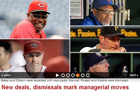 [스포츠투데이 박종규 기자]박찬호를 중용했던 피츠버그의 존 러셀 감독이 해임됐다.피츠버그는 5일(한국시간) 러셀 감독을 해임했다고 공식 발표했다. 또 밀워키와 뉴욕 메츠도 감독 해임을 결정했다. 지난 2008년 피츠버그 사령탑에 오른 러셀 감독은 3년간 부진한 성적표를 남겼다. 2008년 67승 95패, 지난해 62승 99패, 올시즌 57승 105패로 3년 연속 내셔널리그 중부지구 최하위에 머물렀다.밀워키도 켄 마카 감독과 결별을 통보했다. 마카 감독은 지난해 80승 82패, 올시즌 77승 85패로 포스트시즌 진출에 실패했다. 뉴욕 메츠는 제리 마누엘 감독과 오마 미나야 단장을 동시에 해임했다. 올시즌 79승 83패로 내셔널리그 동부지구 4위에 머무는 등 최근 4년 연속 포스트시즌 진출에 실패한 팀 분위기를 쇄신했다.한편 15년 만에 포스트시즌에 진출한 신시내티는 더스티 베이커 감독과 2년 계약 연장을 결정했다. 또 애리조나는 감독 대행으로 팀을 이끌던 커크 깁슨을 정식 감독으로 임명했다고 발표했다. 스포츠투데이 박종규 기자 glory@<ⓒ아시아경제 & 재밌는 뉴스, 즐거운 하루 "스포츠투데이(stoo.com)">