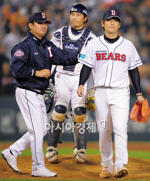 [스포츠투데이 이종길 기자]두산 토종 에이스 김선우가 롯데 강타선을 5이닝 3실점(3자책)으로 막아내며 제 몫을 톡톡히 해냈다. 김선우는 5일 잠실구장에서 열린 롯데와의 프로야구 준 플레이오프 5차전에 선발 등판해 5이닝 7피안타 3실점(3자책)을 기록했다. 총 73개의 공을 던졌고 최고 구속은 시속 146km였다. 탁월한 땅볼 유도 능력에 탈삼진 2개를 추가한 그는 6회 3타자 연속 안타를 허용한 뒤 고창성에게 마운드를 넘겼다. 이날 김선우는 직구와 컷패스트볼을 번갈아 던졌다. 커브도 13개를 구사했다. 1, 2회를 무실점으로 깔끔하게 막은 그는 3회 잠시 흔들렸다. 출발이 좋지 않았다. 전준우와 강민호에게 내리 안타를 허용했다. 이어진 1사 만루 위기. 두산 불펜에서는 어느덧 이현승과 고창성이 몸을 풀기 시작했다. 김선우는 주무기인 컷패스트볼을 앞세워 위기 탈출을 노렸다. 이는 야수들의 수비도움과 어우러지며 주효했다. 1루수 최준석은 자신에게 굴러오는 손아섭의 타구를 침착하게 잡아 용덕한에게 연결, 3루 주자 강민호를 아웃시켰다. 김선우는 폭투로 3루 주자 황재균에게 득점을 허용했지만, 조성환을 투수 앞 땅볼로 잡아내며 추가 실점을 허용하지 않았다.김선우는 4회와 5회를 모두 삼자범퇴로 막아냈다. 컷패스트볼의 위력이 빛났다. 이날 그는 5회까지 총 8개의 땅볼을 이끌어냈다. 하지만 충분한 휴식을 갖지 못하고 등판한 탓일까. 김선우는 6회 난타당하기 시작했다. 김주찬, 손아섭, 조성환에게 연속 안타를 맞으며 한 점을 더 내줬다. 팀이 5회 2점을 추가하며 9-1로 앞서 다소 집중력이 흐트러진 듯했다.김선우는 고창성에게 바통을 넘겨주고 마운드를 내려왔다. 이후 등판한 고창성이 이대호에게 우전 적시타를 얻어맞아 실점은 3점으로 늘어났다.