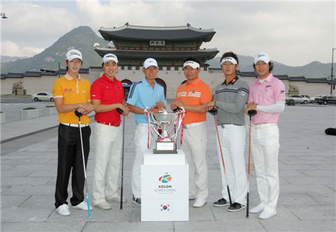노승열과 배상문, 앤서니 김, 양용은, 대니 리, 김대현(왼쪽부터)이 한국오픈을 이틀 앞둔 5일 광화문 광장에 모여 선전을 다짐하고 있다. 사진=JNA제공