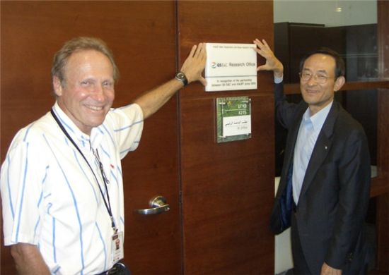 GS건설이 '중동의 MIT'라 불리는 사우디 카우스트대와 국내기업 최초로 산학협력을 맺고 캠퍼스 내에 GS건설 거점연구소를 설립했다. 연구소 현판 앞에서 GS건설 이영남 기술본부장(오른쪽)과 세계적인 수처리 분야 전문가로 손꼽히는 게리 아미(Gary Amy) 교수가 포즈를 취하고 있다.<br />