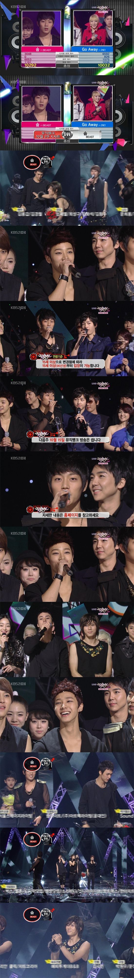 [스포츠투데이 최준용 기자]비스트가 컴백 1주 만에 가요계 정상을 차지하는 기염을 토했다.비스트는 8일 오후 5시 50분 방송된 KBS2 '뮤직뱅크'에 출연해 새 미니음반 ‘마스터마인드’(Mastermind)의 타이틀 곡 ‘숨’을 공개했다. 비스트는 컴백 1주 만에 2NE1을 제치고 K차트 1위를 차지하며 가파른 상승세를 보였다.이날 비스트는 “항상 우리를 위해 고생하는 소속사 식구들 그리고 팬들에게 이 영광을 돌리겠다”고 밝혔다.이날 비스트는 더욱 강렬해진 퍼포먼스와 성숙한 보컬로 성공적인 무대를 선보였다. 보다 성숙해진 무대에 팬들은 더욱 큰 환호를 보냈다.비스트는 ‘마스터마인드’란 당찬 타이틀의 새 앨범을 발표했다. ‘마스터마인드’란 이번 음반의 타이틀이자 인트로 트랙의 제목으로 ‘무언가를 치밀하게 조종하는 뛰어난 자’를 뜻한다. 이에는 비스트가 신인의 틀을 완전히 벗고 자신들만의 음악으로 대중들을 이끌겠다는 포부가 담겨 있다.한편 이날 무대에는 맹유나, 문지은, Gavy NJ, 5tion, 오종혁, 남녀공학, 선민(특별출연. MBLAQ 승호), 슈프림팀, 서영은(Feat. PS영준), 유키스(U-Kiss), 장혜진, 미쓰 에이(miss A), 임정희, FT아일랜드, 김범수, BEAST, 세븐, 샤이니(SHINee), 가인, 2NE1 등이 참여해 멋진 기량을 펼쳤다.스포츠투데이 최준용 기자 yjchoi01@<ⓒ아시아경제 & 재밌는 뉴스, 즐거운 하루 "스포츠투데이(stoo.com)">