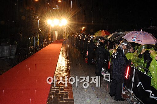 [부산=스포츠투데이 고경석 기자]아시아태평양연기자네트워크(APAN) 레드카펫 행사가 우천으로 인해 행사진행에 차질을 빚었다.APAN 측은 8일 오후 8시 부산 해운대구 피프 파빌리온 앞에서 스타로드 레드카펫 행사를 진행했으나 우천으로 인해 30분 이상 지연되는 사태를 빚었다. 이날 행사에는 손예진 김윤진 공효진 이민정 지성 박보영 박희순 황우슬혜 민효린 김혜나 한지혜 최정원 백성현 고준희 봉태규 최강희 유선 왕지혜 등이 참석했으나, 오후 8시께부터 내리기 시작한 빗줄기가 굵어지면서 진행에 차질이 빚어졌다. 악천후 속에서도 스타들의 모습을 직접 보기 위해 수백명의 팬들이 행사장 주위에 모여들었고 배우들이 하나둘씩 행사장에 모습을 드러낼 때마다 환호성을 지르며 반가움을 표했다. 한편 이날 행사에 참여한 배우들은 오후 9시 30분께부터 해운대구 노보텔 그랜드볼룸에서 시작되는 '김동호 집행위원장 감사패 전달식'에 참석했다.스포츠투데이 고경석 기자 kave@<ⓒ아시아경제 & 재밌는 뉴스, 즐거운 하루 "스포츠투데이(stoo.com)">