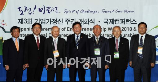 [아시아경제 이재문 기자]최경환 지식경제부 장관과 경제5단체장들이 11일 오전 서울 삼성동 그랜드 인터컨티넨탈호텔에서 열린 제3회 기업가정신주간 개회식에 앞서 포즈를 취하고 있다.(왼족부터) 오영호 무역협회 부회장, 김기문 중소기업중앙회 회장, 손경식 대한상의 회장, 최경환 지식경제부 장관, 손길승 SK 텔레콤 명예회장, 정병철 전경련 부회장, 김영배 경총 부회장.이재문 기자 moon@<ⓒ세계를 보는 창 경제를 보는 눈, 아시아경제(www.asiae.co.kr) 무단전재 배포금지>