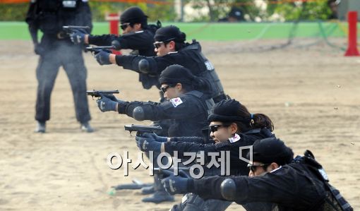 [아시아경제 이재문 기자]12일 서울 서초구 방배2동 서울경찰청 경찰특공대에서 열린 '국회 행정안전위원회 대테러 현장 시찰'에서 경찰특공대원들이 사격 시범을 보이고 있다.이재문 기자 moon@<ⓒ세계를 보는 창 경제를 보는 눈, 아시아경제(www.asiae.co.kr) 무단전재 배포금지>