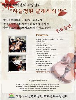 이번 공연은 정의여중 학생들의 댄스공연을 시작으로 모던팝스오케스트라 피아노 4중주단의 ▲오페라 ‘지옥의 오르페오’ 중 ‘캉캉 사랑의 인사’ ▲뮤지컬 ‘맘마미아’ 히트곡 ▲거위의 꿈 ▲10월의 어느 멋진 날에 ‘라데츠키 행진곡’ 등 가을의 분위기에 맞는 무대가 펼쳐진다.모던팝스오케스트라는 다양한 장르를 접목 추구하는 오케스트라로 1996년 창단 이후 문화예술 발전과 국민의 정서 함양에 기여해 지난 2009년에는 문화관광부장관 표창장을 수상하기도 했다.학마을다사랑센터 관계자는 “이번 공연은 음악에 대한 해설이 곁들여져 어른부터 아이까지 클래식에 대한 새로운 인식을 갖게 해줄 것”이라며 “구민여러분의 많은 참여 바란다”고 말했다.학마을다사랑센터(☎ 901-5192)박종일 기자 dream@<ⓒ세계를 보는 창 경제를 보는 눈, 아시아경제(www.asiae.co.kr) 무단전재 배포금지>