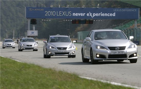 [아시아경제 최일권 기자] 렉서스의 IS F는 마치 '두얼굴을 가진 사나이'와 같았다. 정지와 주행시 모습이 전혀 딴판이기 때문이다.지난 15일 강원도 태백 레이싱파크에서 IS F를 시승했다. 외관은 다른 렉서스 차종과 다를 게 없었지만 성능은 기존 렉서스에서는 찾아볼 수 없는 파워가 느껴졌다.IS F는 스포츠 세단인 IS를 기반으로 엔진과 트랜스미션을 업그레이드한 고성능 차량이다. 렉서스가 새롭게 내건 'F 시리즈'는 ‘운전하는 즐거움’을 극한까지 추구하는 것을 목적으로 하고 있다. 실제로 IS F는 기존 렉서스와 차별화됐다. 전용 엔진과 서스펜션이 적용돼 성능을 최대한 발휘할 수 있도록 했다. IS F 개발 총 책임자인 야구치 유키히코 수석 엔지니어는 "렉서스가 선보인 전혀 새로운 스타일의 스포츠 세단"이라고 정의했다.태백 레이싱파크는 직선주로와 함께 급커브 구간이 많아 가속페달과 브레이크를 번갈아가면서 밟아야 하는 특징이 있다. 특히 일부 구간에 슬라럼을 설치해 빠른 속도에서 코너링 능력을 평가하도록 했다.이번 시승은 철저히 차의 성능에만 맞춰졌다. 레이싱코스를 달려야 하는 만큼 운전자들은 모두 안전 헬멧을 착용했으며 차를 구석구석 살필 여유가 없었다. 헬멧 때문에 차 내부를 살펴보기도 힘들었다.IS F 주행 모드는 일반과 스포츠 등 2가지로 돼 있다. 일반 모드가 승객들의 안락함에 중점을 뒀다면 스포츠 모드는 그야말로 차의 성능을 몸소 느낄 수 있게 한 것이다.시승은 스포츠 모드 상태에서 진행됐다. 출발과 함께 가속 페달을 힘껏 밟았다. 렉서스 브랜드가 조용한 차로 알려진 것과 마찬가지로 IS F 역시 예상보다 소음이 심하지 않았다.시속 100km는 4.8초만에 가뿐히 돌파했다. 이 차에는 자동과 함께 수동 변속이 함께 장착돼 있었는데, 응답성을 높이기 위해 수동 변속을 사용했다. 1단에서도 시속 100km를 넘어섰다.가장 놀라운 성능은 코너링이었다. 시속 200km에 육박하다가 거의 300도에 가깝게 회전을 해야 하는 상황에서 속력을 80~90km 내외로 줄였다. 회전에서 이 정도 속도도 빠른 편이지만 코너링은 거의 완벽했다. 밀리는 느낌도 전혀 없었고 매우 안정적이었다. 일본에서 온 엔지니어들도 코너링에 상당한 자신감을 나타냈다.IS F에는 렉서스 최초의 스포츠 엔진으로 개발된 V8 5.0 리터 엔진이 장착됐다. 이 엔진은 야마하에 의뢰해 개발됐다. 직분사와 포트분사를 모두 갖춘 듀얼분사로, 엔진의 최대한의 퍼포먼스를 낼 수 있게 했다. 이에 따라 최고 출력 423ps/6600rpm, 최대 토크 51.5kg·m/5200rpm의 성능을 발휘한다. 공인 연비는 리터당 8.4km다.다만 수동 변속 모드가 다른 차량과 달라 초기 적응에 애를 먹었다. 일반적으로 수동모드로 단수를 높였을 경우 차량 속도가 줄어들면 자동으로 단수가 낮아진다. 하지만 IS F는 속도가 줄어도 단수는 변하지 않는다.이 차 개발에 참여한 바 있는 마쓰시타 노부오 렉서스 엔지니어는 "수동 변속기와 똑같은 원리로 만들었다"고 설명했다.전문 레이서가 몰아보는 IS F는 더욱 새로웠다. 시속 100km를 넘어서는 상황에서 코너링을 시도해도 무리가 없었다. IS F를 진정으로 느낄 수 있는 기회였다.IS F는 첨단 안전 기술을 하나의 시스템으로 통합시켰다. 특히 VDIM이 눈에 띈다. 이날 시승회에는 VDIM 경험 행사도 열렸다.VDIM(Vehicle Dynamics Integrated Management)은 전자 제어 스로틀을 통해 EPS(전자식 파워 스티어링), VSC(차체 안정성 제어장치), TRAC(트랙션 제어장치), ABS(안티록 브레이크 시스템), BA(브레이크 어시스트), EBD(전자식 제동력 배분장치) 등을 통합 관리한다. VDIM 때문에 IS F는 미끄러운 커브길에도 차의 중심이 흔들리지 않는다.이외에도 고속 주행시 발생되는 과도한 부하와 열에 의한 변형을 막기 위해 레이싱 차에 사용되는 고강성의 유리섬유를 언더커버에 적용했다. 계기판에서 한가지 아쉬웠던 점은 속도계가 다른 차량에 비해 작다는 것이다. 대신 엔진횟수 계기판이 중앙을 차지했다. 이 때문에 속도를 제대로 보기가 힘들었다. 가격은 8800만원(부가세 포함).