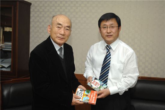 김성환 노원구청장이 상계동에 사는 주용로씨(81)로부터 일본도서 등 1000여권을 기증받았다