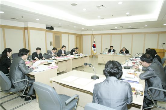 이제학 양천구청장 등 국장급 간부들이 도시락을 시켜먹으며 토론을 벌이고 있다.